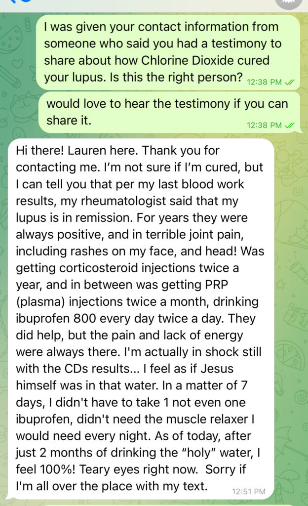 “Hi there! Lauren here. Thank you for contacting me. I’m not sure if I’m cured, but I can tell you that per my last blood work results, my rheumatologist said that my lupus is in remission. For years they were always positive, and in terrible joint pain, including rashes on my face, and head! Was getting corticosteroid injections twice a year, and in between was getting PRP (plasma) injections twice a month, drinking ibuprofen 800 every day twice a day. They did help, but the pain and lack of energy were always there. I’m actually in shock still with the CDs results… I feel as if Jesus himself was in that water. In a matter of 7 days, I didn’t have to take 1 not even one ibuprofen, didn’t need the muscle relaxer I would need every night. As of today, after just 2 months of drinking the “holy” water, I feel 100%! Teary eyes right now….”
